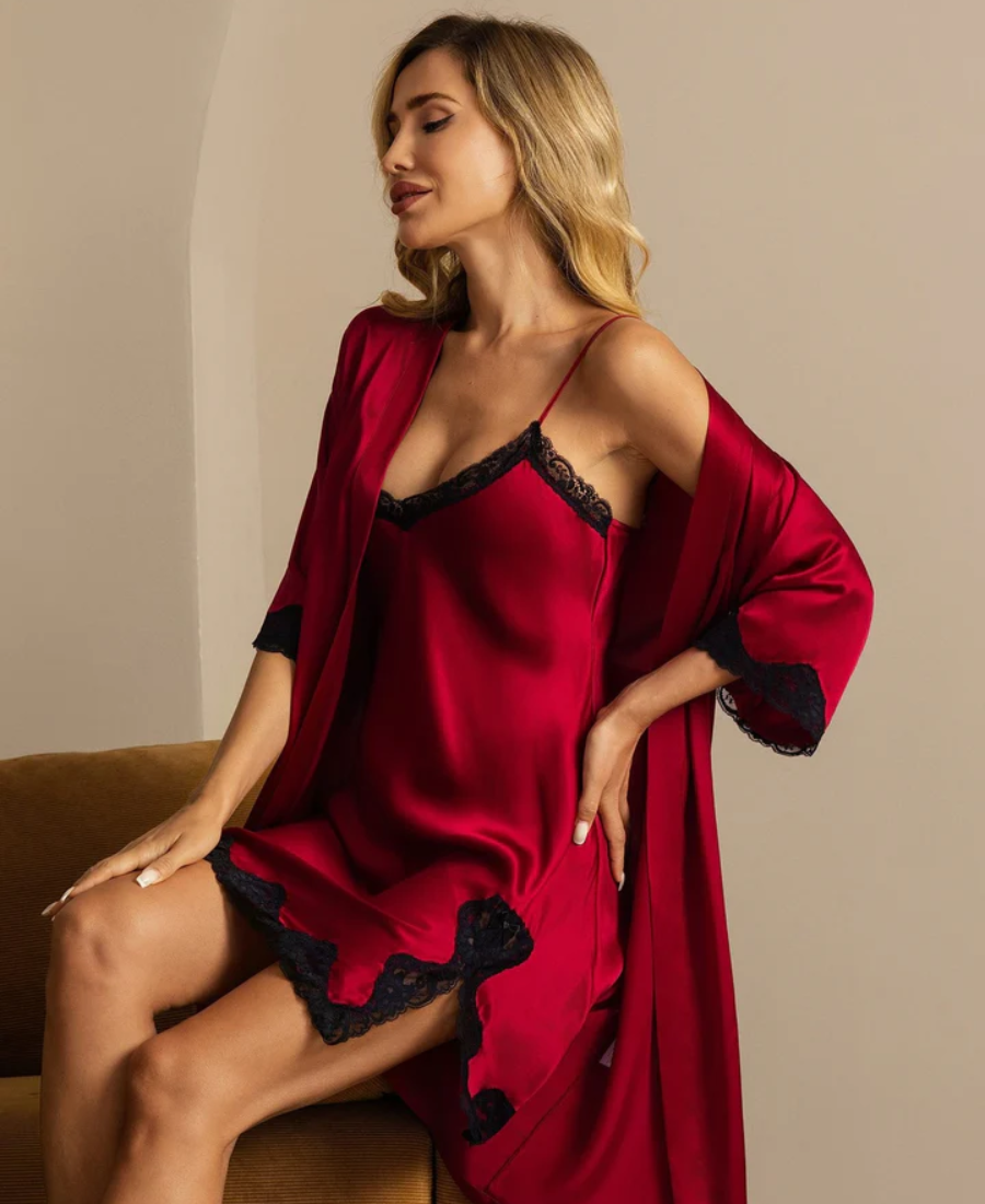 Pure Silk Basic Lace Trimmed Split Nightgown&Robe Set 2Pcs