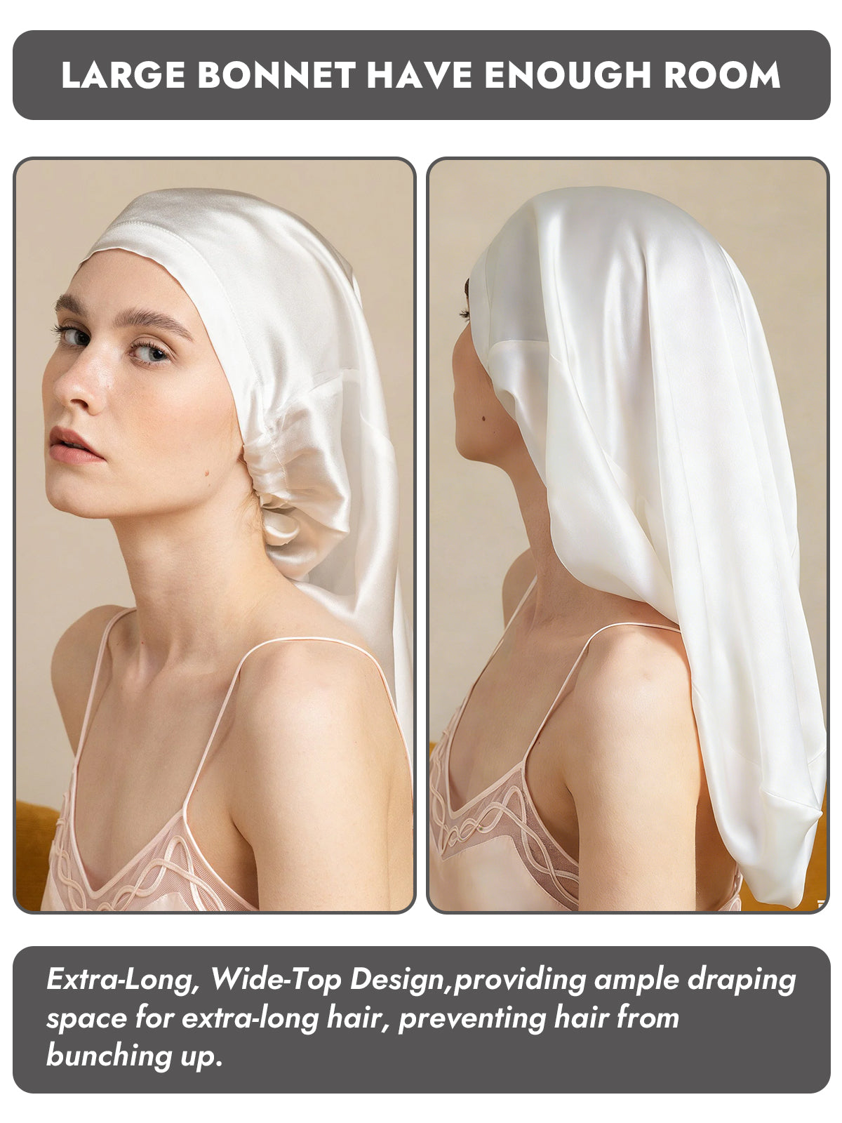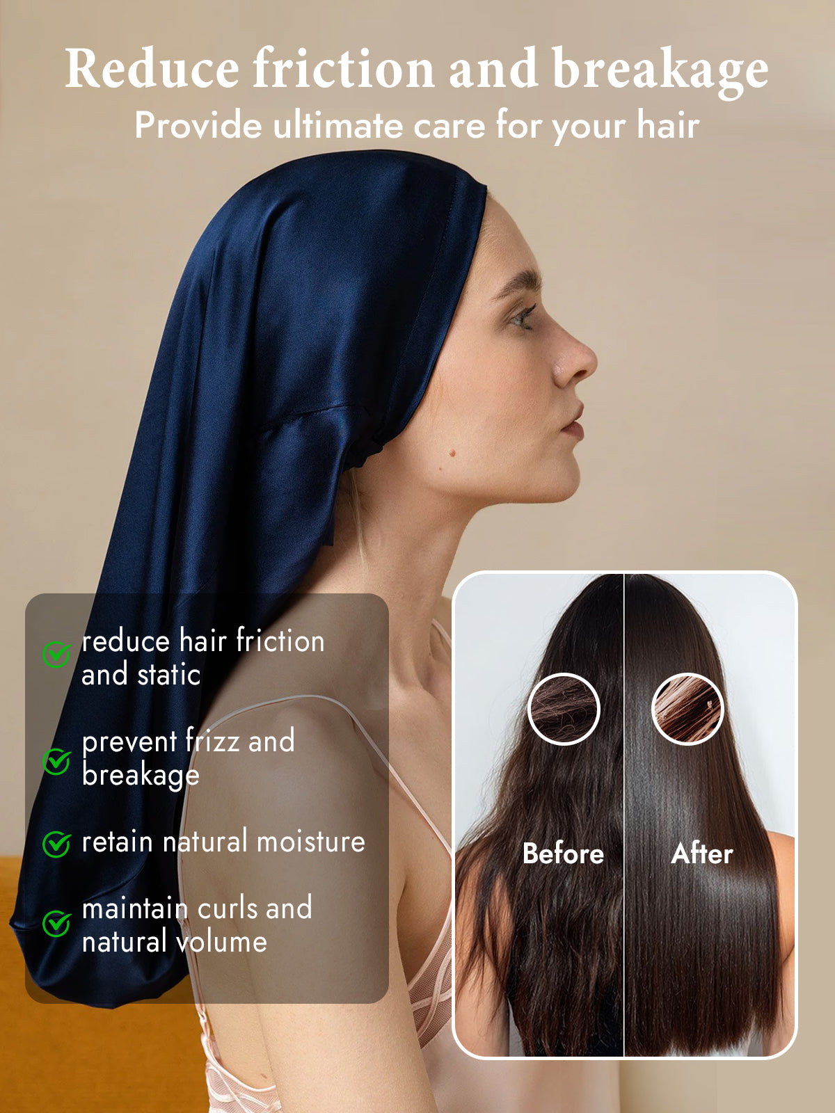 I’ve got straight but frizzy hair which goes down to my waist but goes crispy and dry at the ends every time I sleep on it. No matter how I do my hair for bed - in a plait, a pineapple bun, in heartless curl sets, in a satin scarf tied up, satin pillowcase — it comes out super frizzy with rough bent ends the next day. It also gets greasy quickly abd just looks meh even if I do a fresh blow out at night time ready for the morning. I also find these styles incredibly uncomfortable to sleep in. just bought one of these long hair bonnets and used it last night for the first time and OMG. My hair looks even more shiny and perfect than it did when I first blow dried it yesterday morning. It was comfortable to sleep in, much more so than wearing any of the other styles I’ve tried, as I didn’t need to do anything with my hair once it was inside the bonnet, it just stayed loose. My hair also seems less oily on day 2 than it usually does. I am so happy with my purchase and will never sleep without a silk bonnet like this one from now on.