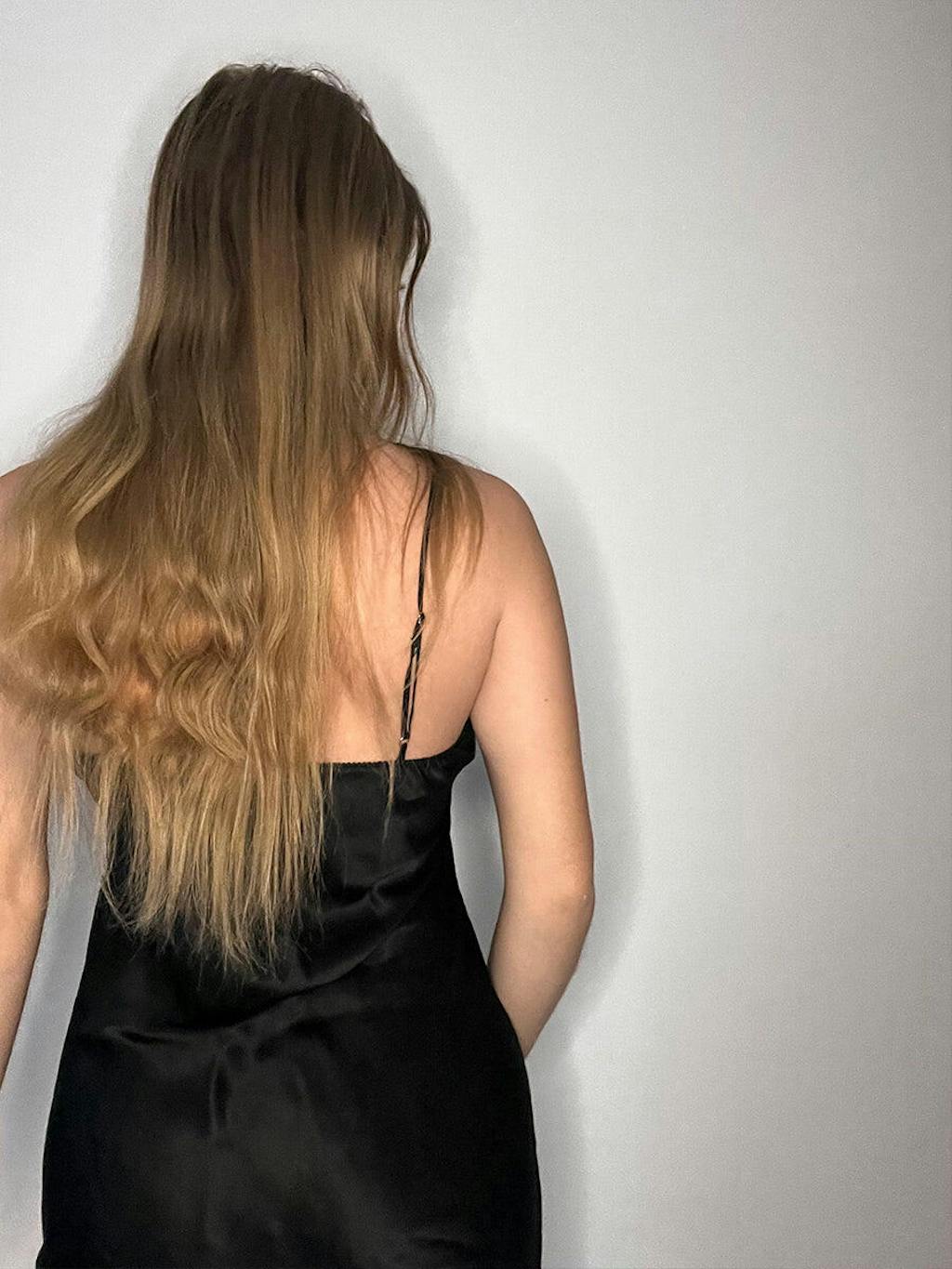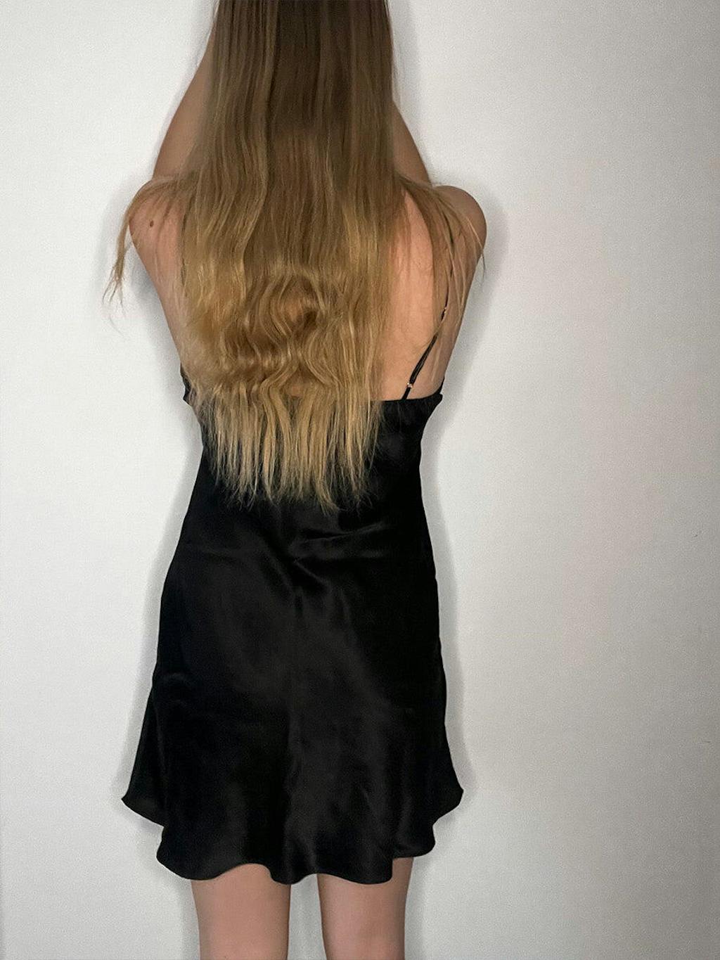 I'm totally digging the sleek shine of this silk fabric! Plus,the way it drapes and feels against my skin is just heavenly. Can't get enough of it!