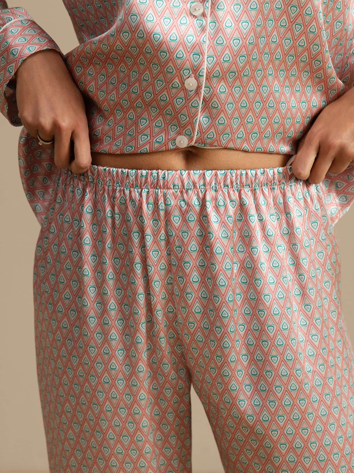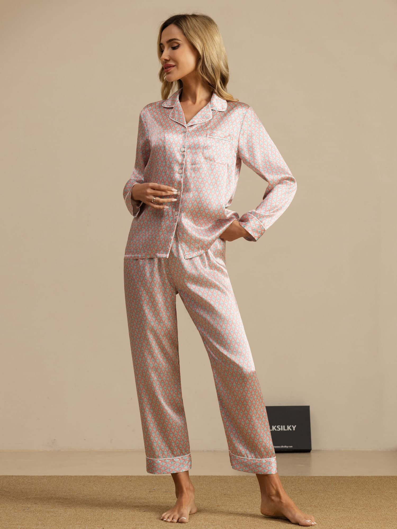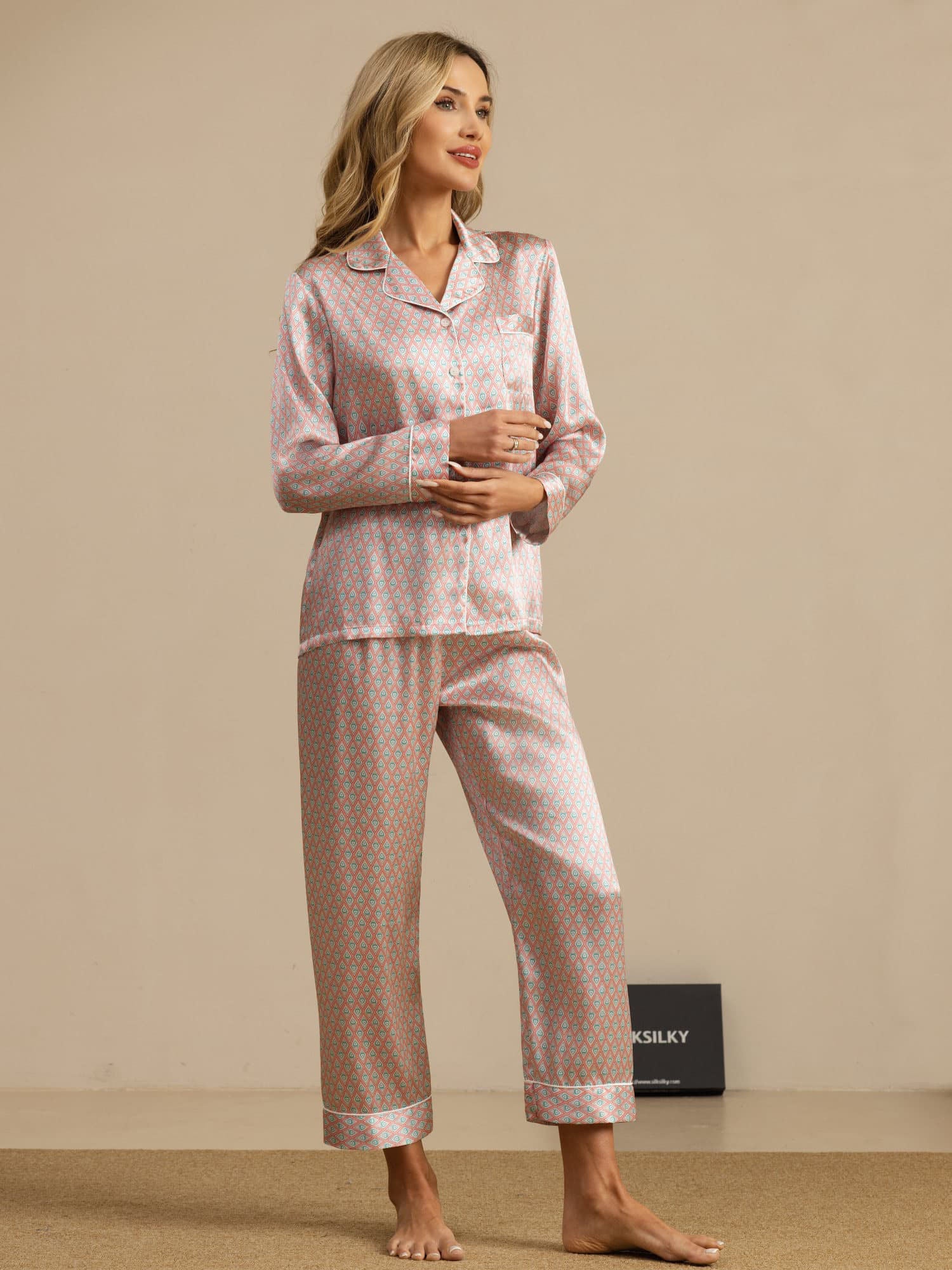 Women's Pure Silk Geometric Print Long Sleeve Pajamas Set With Pants