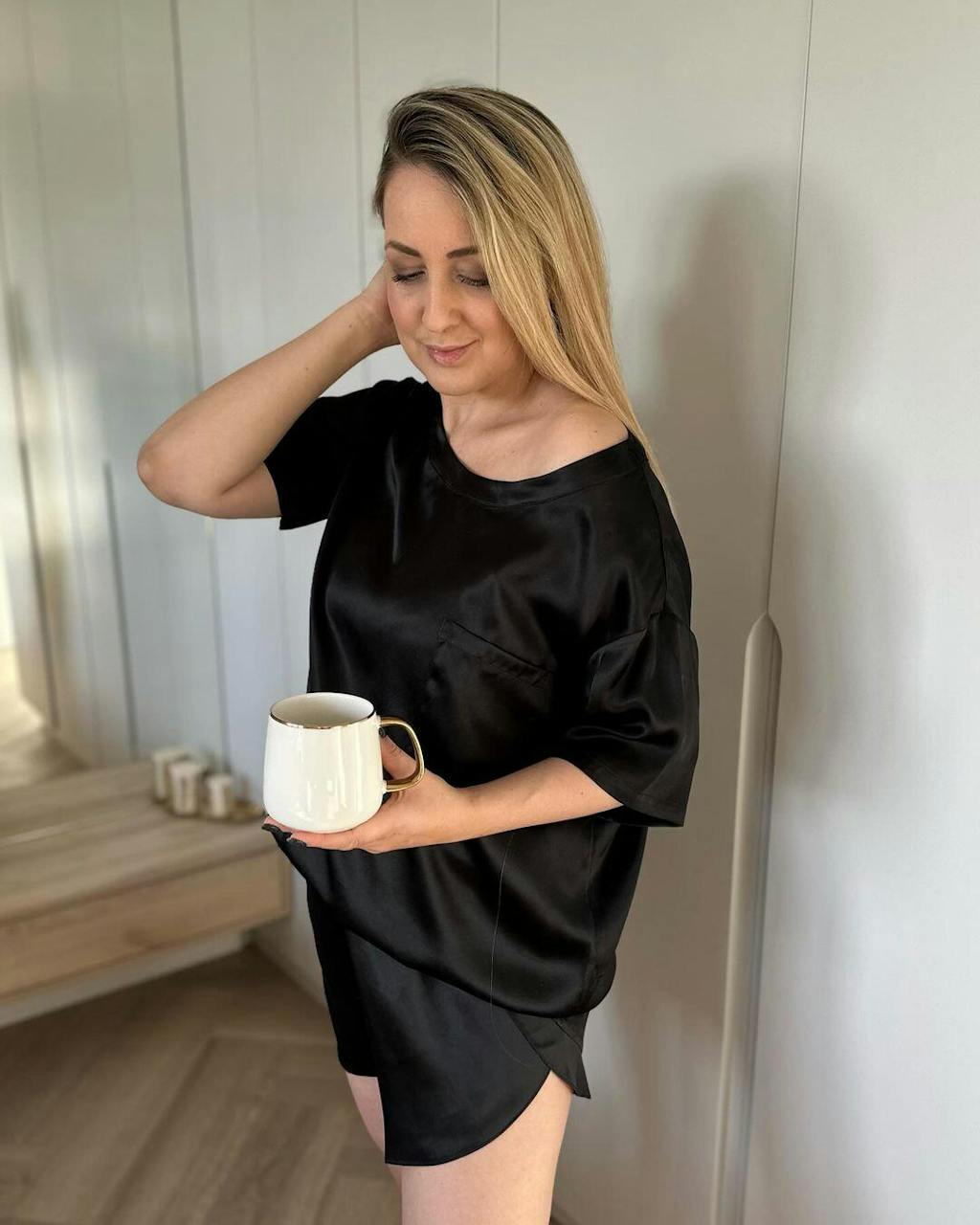 The pure silk pajama set is available in sizes S to XL. Refer to the model's measurements and size chart to find your perfect fit. You can also feel free to consult to our customer services if you have any questions.