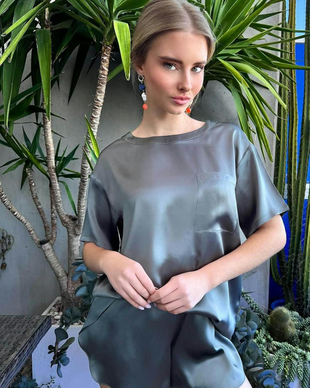 Elevate your loungewear with our exquisitely designed oversize silk pajama set. Featured round neckline, unique tulip hem design and elastic waistband, this set combines elegance and comfort, perfect for unwinding at home or enjoying a restful night's sleep.
