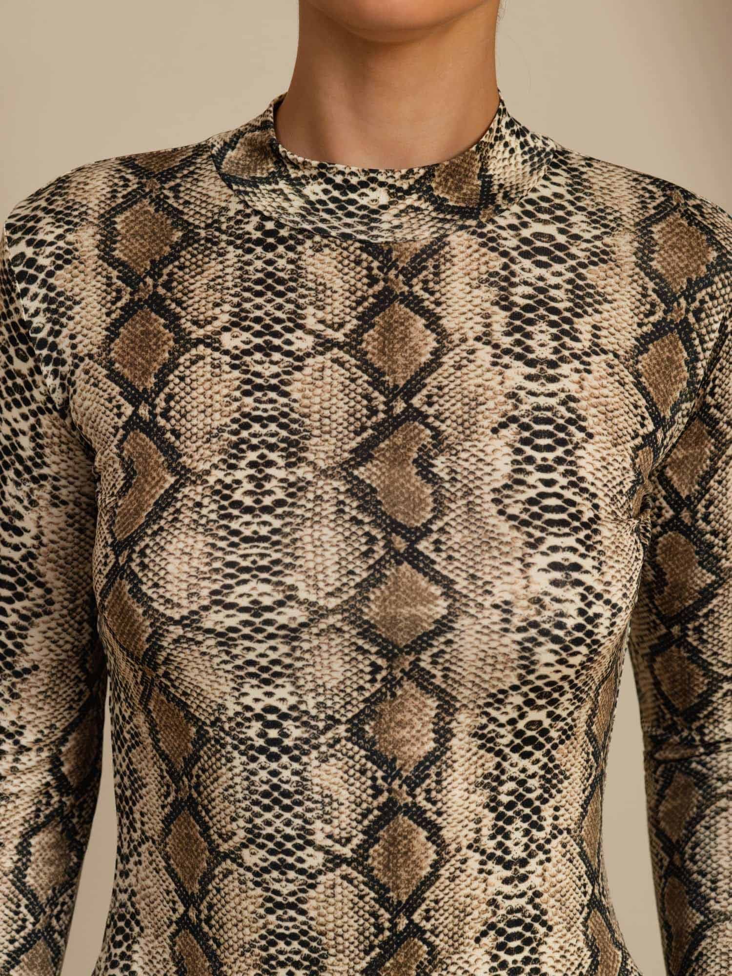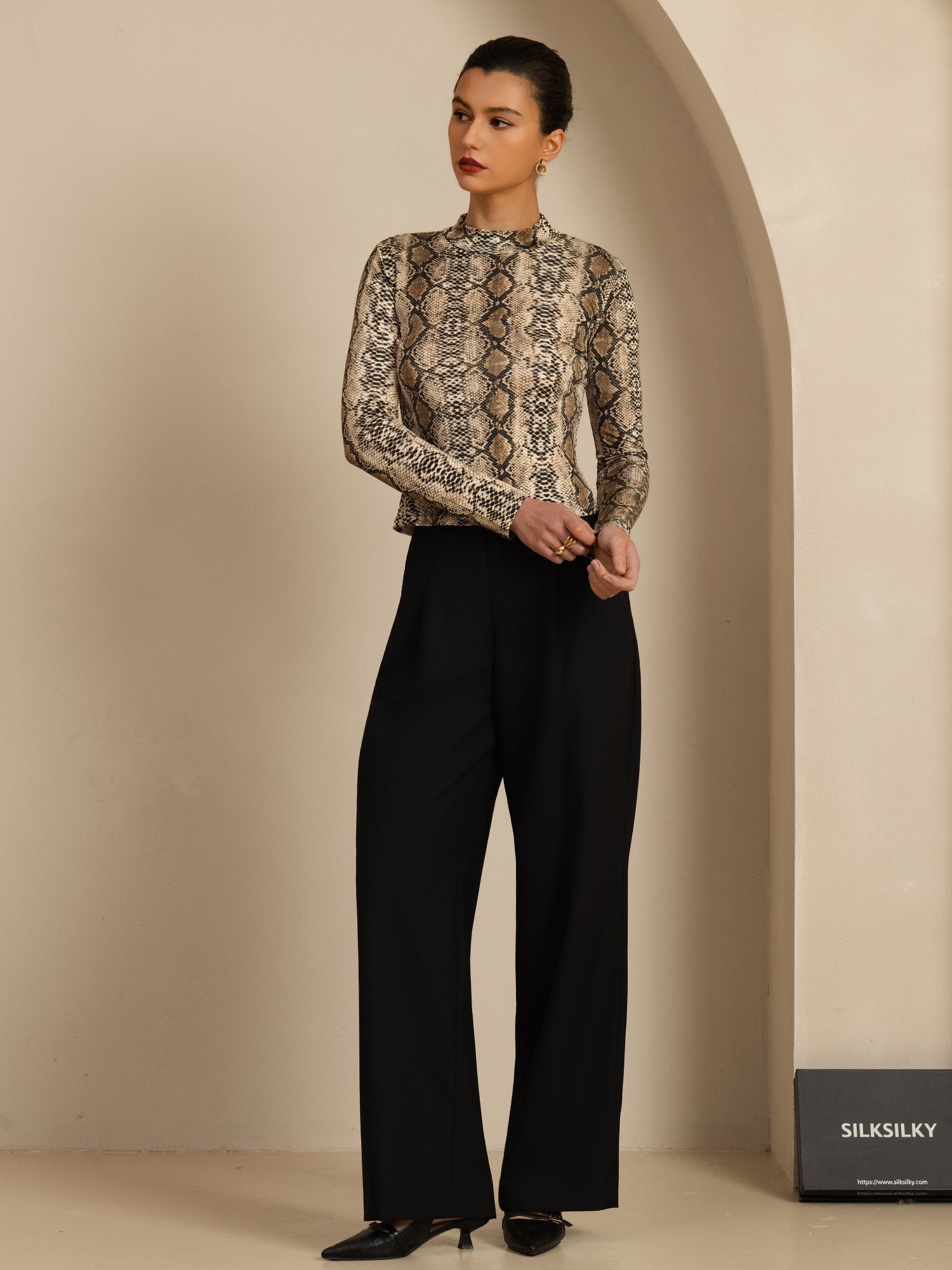 Made from 100% silk jersey, this top offers a smooth, lightweight feel with natural stretch for a comfortable, second-skin fit. The mock neck adds a refined, modern touch, while the slim silhouette enhances the body’s natural shape. Featuring a bold animal print with subtle retro influence, it blends elegance with a confident edge—perfect for both casual wear and going out.