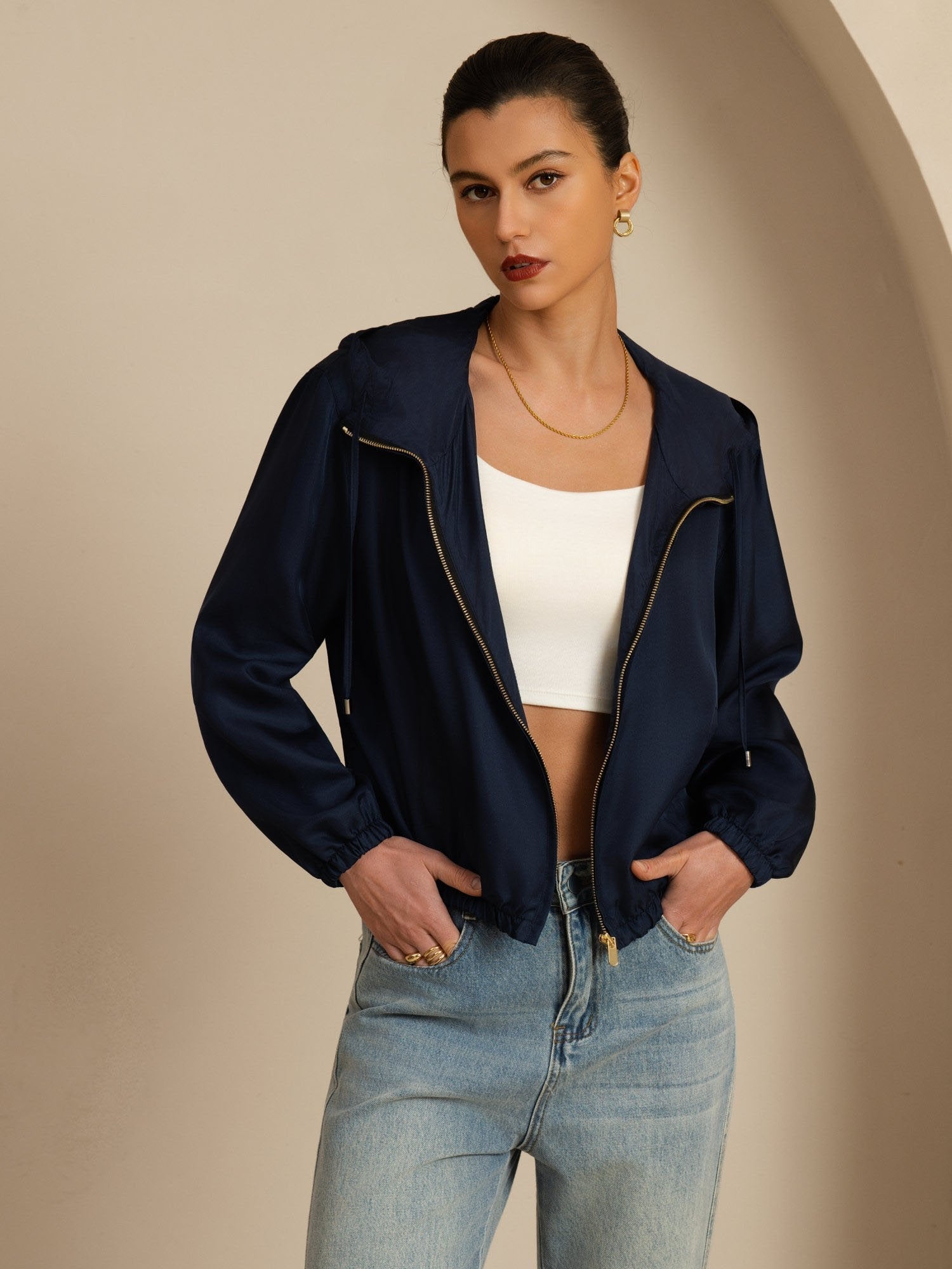 Designed in 18Momme silk satin surah, this jacket delivers a sleek drape with a delicate sheen and breathable comfort. The hood with adjustable drawstring adds practicality and a relaxed sporty vibe, while the structured stand collar enhances its clean, modern look. A smooth front zipper ensures easy layering, and the cropped cut visually elevates the waistline. Finished with functional pockets, it’s a refined yet versatile piece for daily wear and light activity.